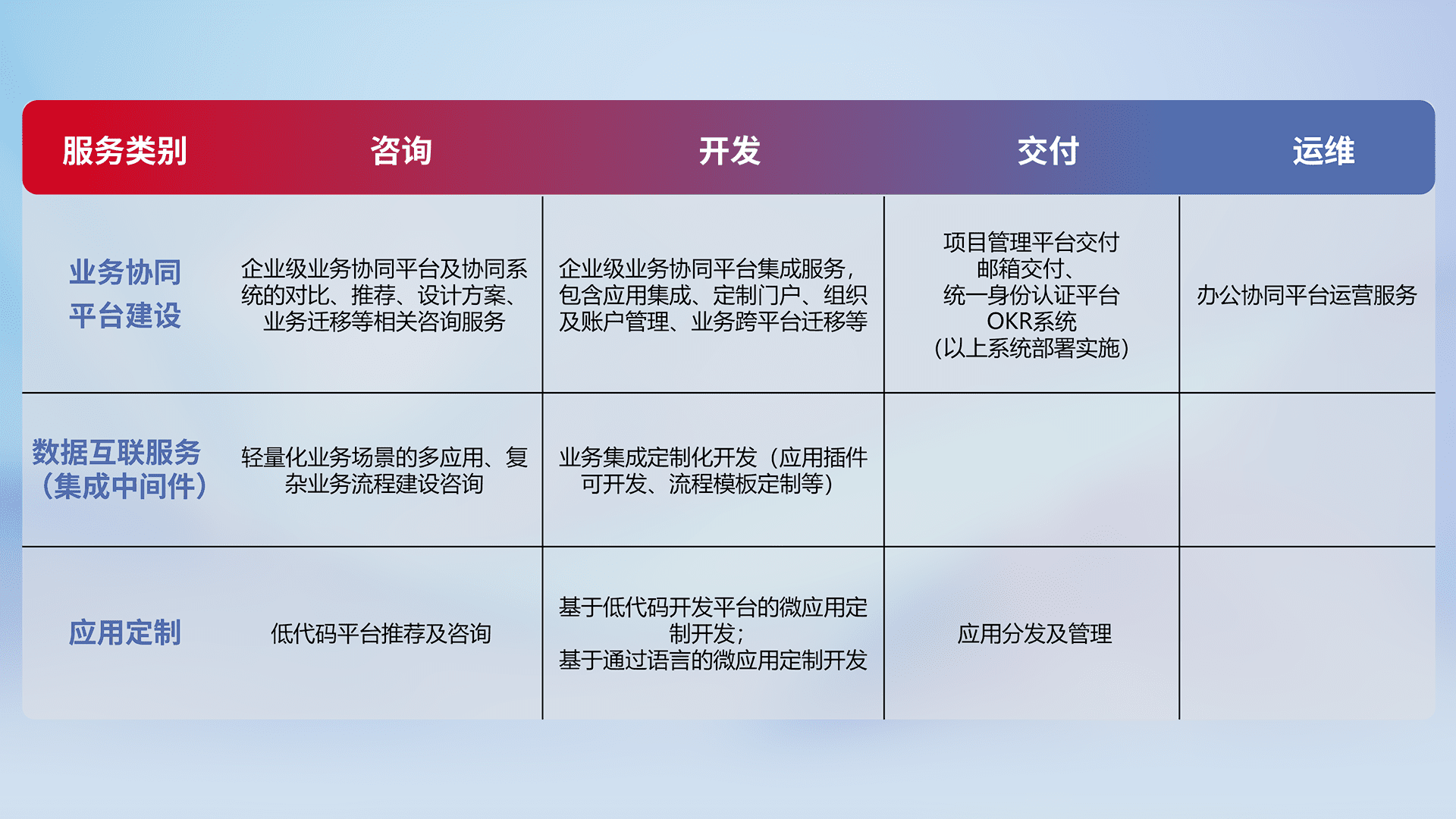 针对钉钉、、企微、、、、IDaas等平台级产品提供产品的规划、、、、方案、、、、交付、、定制化开发等服务,,,,实现如统一协同办公、、智能客户服务、、、混合会议管理、、智能数据查询、、等业务场景,,实现数字化转型。。。。
